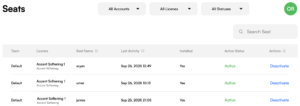 A Manager can deactivate a seat by pressing on the Deactivate link for that seat, or activate a seat by clicking on the Activate link for that seat.